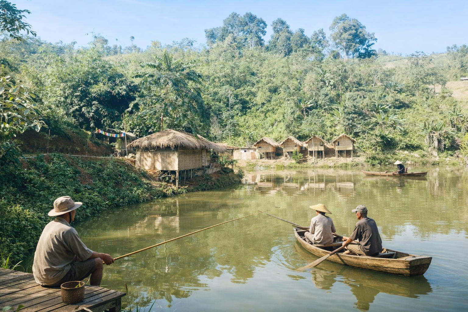 Relax by the serene waters, surrounded by nature's beauty, and embark on a leisurely row, soaking in the peaceful atmosphere. Experience the joy of fishing and create cherished moments at Mridu Jungle Camp's idyllic lakeside haven.